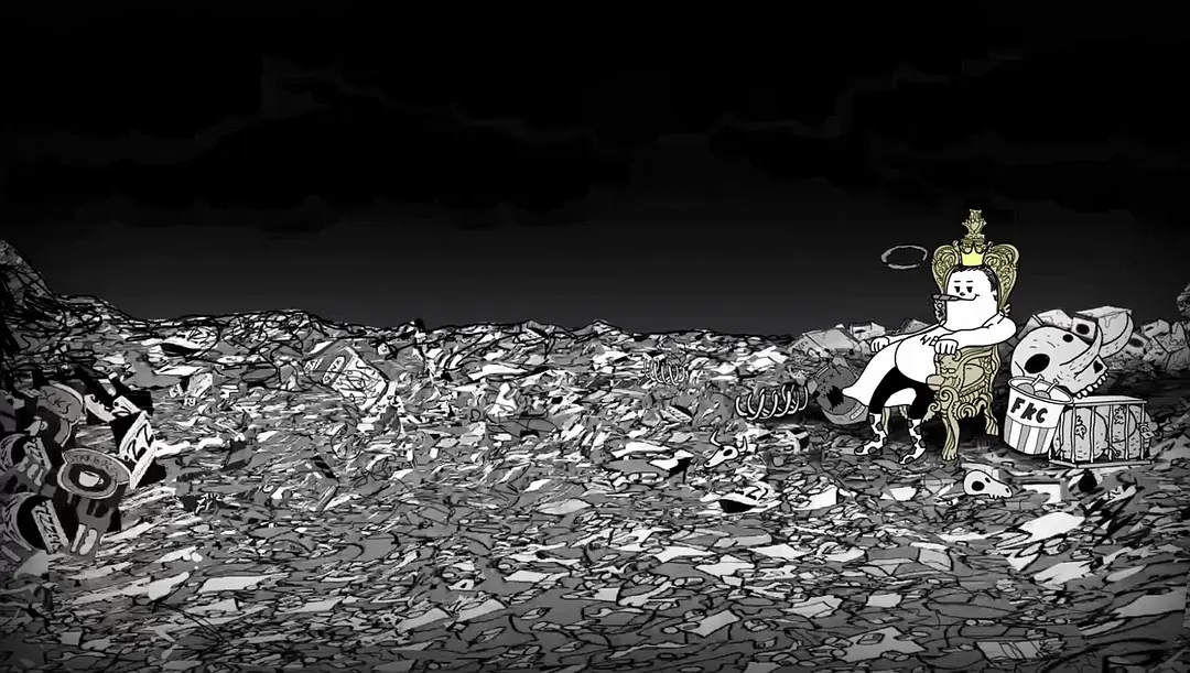 The animation's first half depicts "Man's" step-by-step conquest of nature, from crushing an insect to erecting metallic forests, from hunting wildlife to casually obliterating entire woodlands. However, the scene that most impressed me was the depiction of "Man" on his throne being conquered by aliens. "Man" conquers nature but then commits the ultimate error: he stops progressing. He sits on a throne of garbage, admiring his rule over a ruined planet, and fails to look up at the stars. It evokes my anguish over "Man's" failure, regret that he ceased to "look up" at the sky, and frustration that the gains of his earlier development were lost.